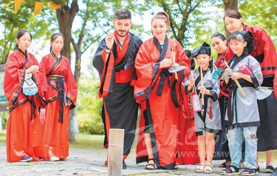 浙江省長興縣陳武帝故宮內,外國游客和學生們一起體驗投壺游戲。